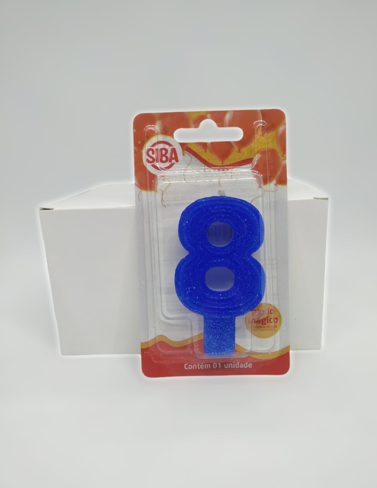Vela de Aniversário Número 8 Plus Big Siba Cor Azul com Glitter no Atacado com 10 Unidades Preço de Fábrica.