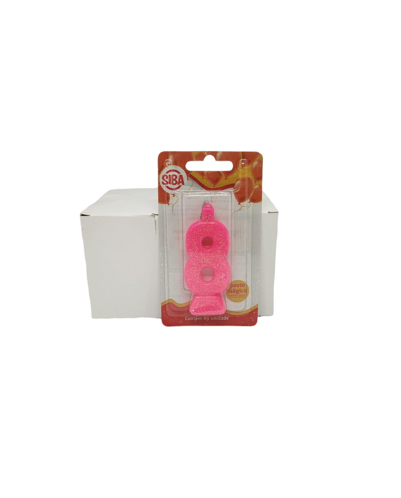 Vela de Aniversário Número 8 Pop (Super) Siba Cor Rosa Com Glitter No Atacado com 10 Unidades Preço de Fábrica.